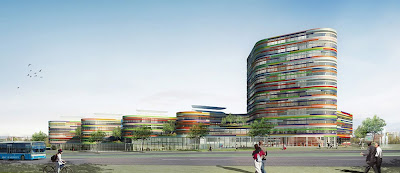 The new building for Hamburg’s Behörde für Stadtentwicklung und Umwelt/BSU (Office for Urban Development and Environment) consists of one high rise and two wing buildings. Public BSU facilities, like areas for exhibitions and restaurants, are located in the street level floors. The foot of the high rise structure will house a central lobby. Like an amphitheater, it is envisioned to host the exhibition of Hamburg’s urban model which will be highly visible through the large glass facade. From here, the library and conference center can be accessed as well. Continue for more after the jump: