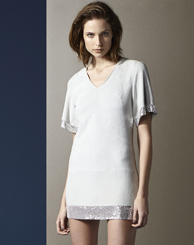 Starting with his invention of stretch leather in 1995 and later the ‘skin jean’ line in 1998, Jean Claude Jitrois has been dedicated to creating leather couture which allows ease of movement. For spring/summer 2014, many elements of sportswear – pseudo-fluoro colours and the humble trackpant – have been borrowed and adapted in stretch leather and suede. The omnipresence of black in the hardware of jackets and dresses is a new departure for the label. Soft drapes, notably in the fall of a loose suede sleeve, are offset with the return of the glossy, ultra-streamlined ‘Minoray’ line – first created in 1998 for the iconic Helmut Newton calendar. – from Jitrois