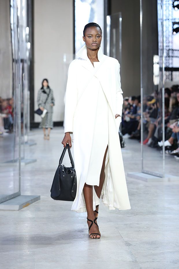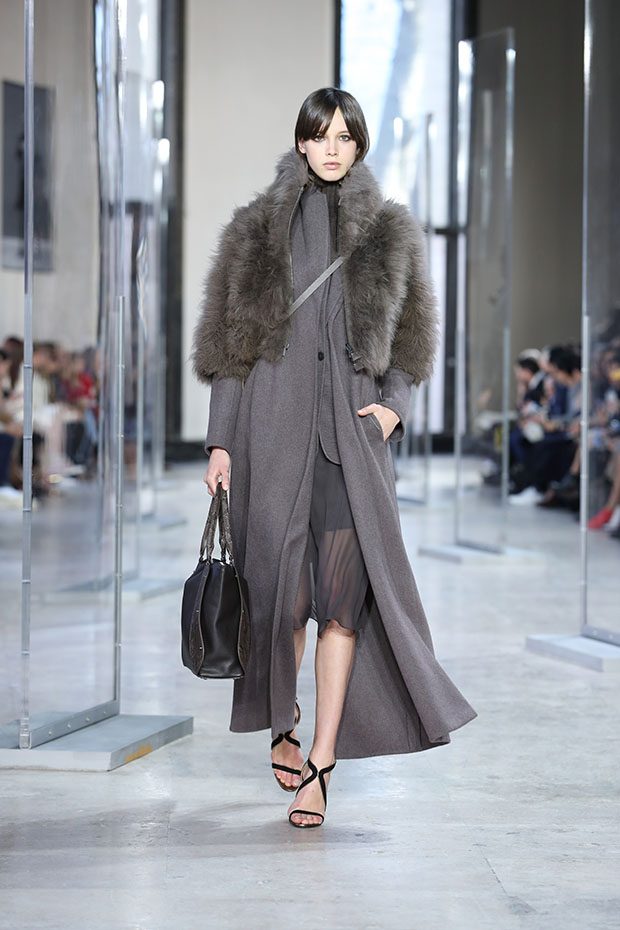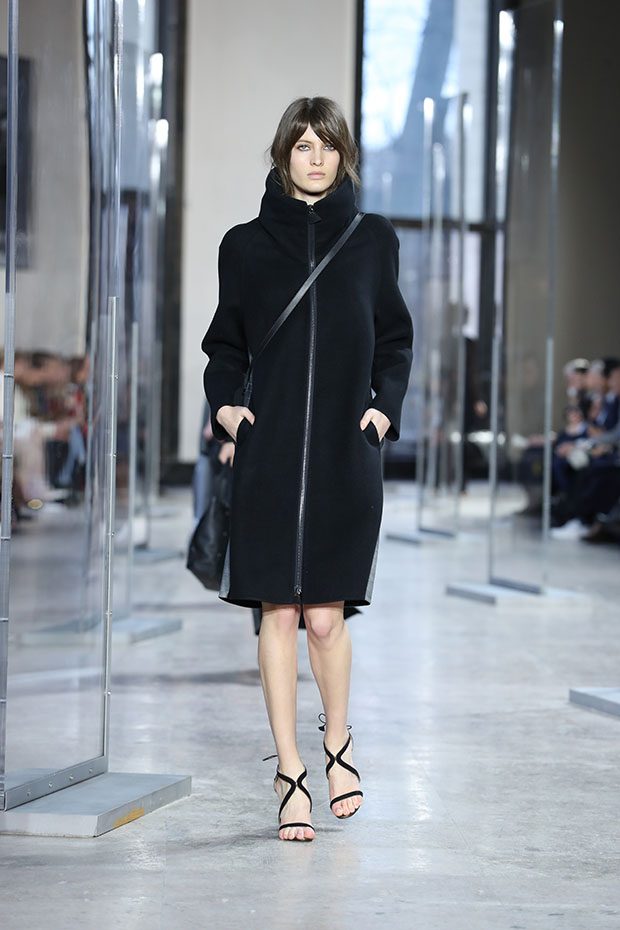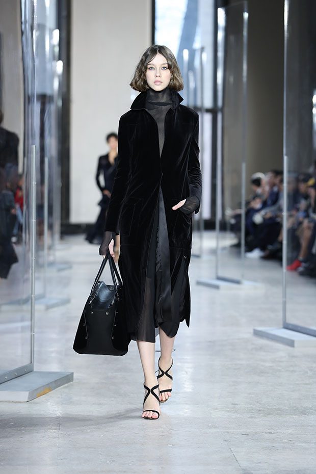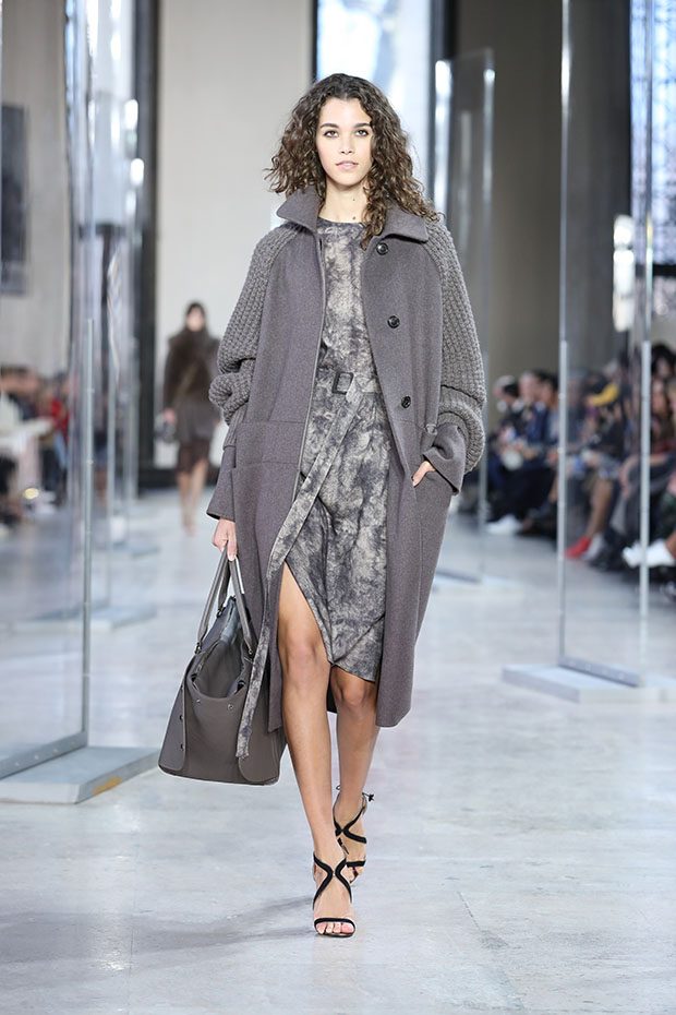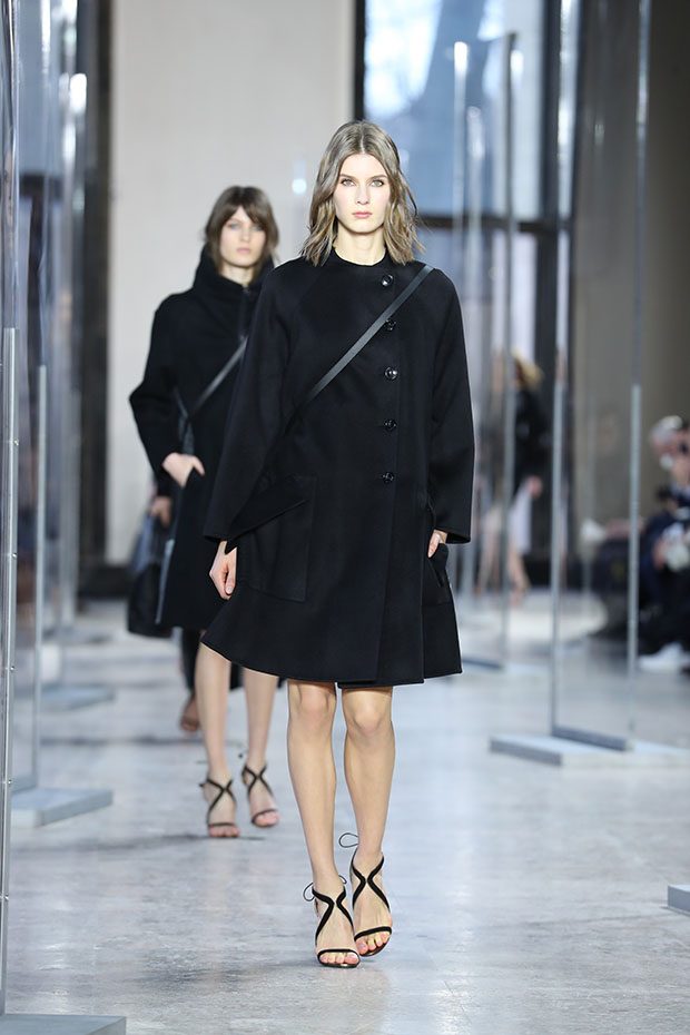The coat and the bag, that is what a woman grabs before stepping out. When she slips into her coat, it happens in a dynamic, sensual and almost unconscious movement. This intuitive, dancing move has been captured by Canadian artist Rodney Graham in an installation (“Der Mantelanzieher”, 2015) as well as in a recent self portrait (“Coat Puller”, 2017). Albert Kriemler’s Akris Fall/Winter 2017/18 collection is about a woman in a coat with a bag. – from Akris