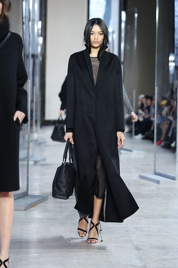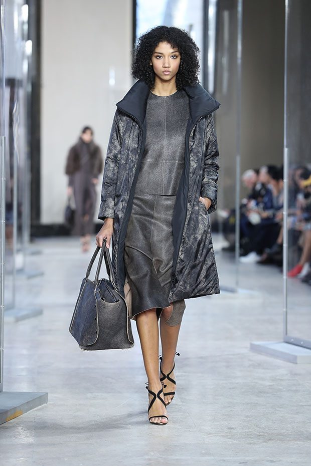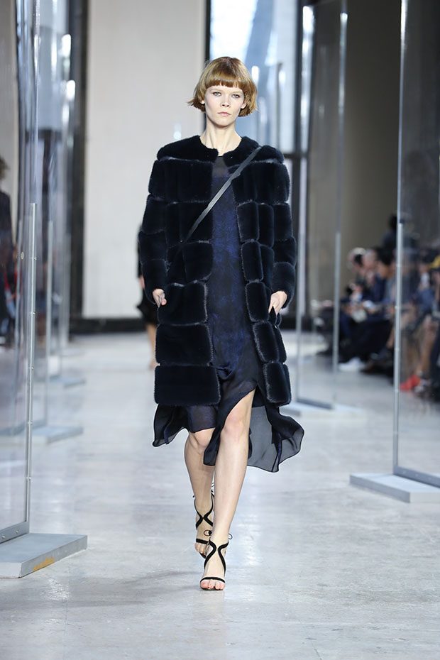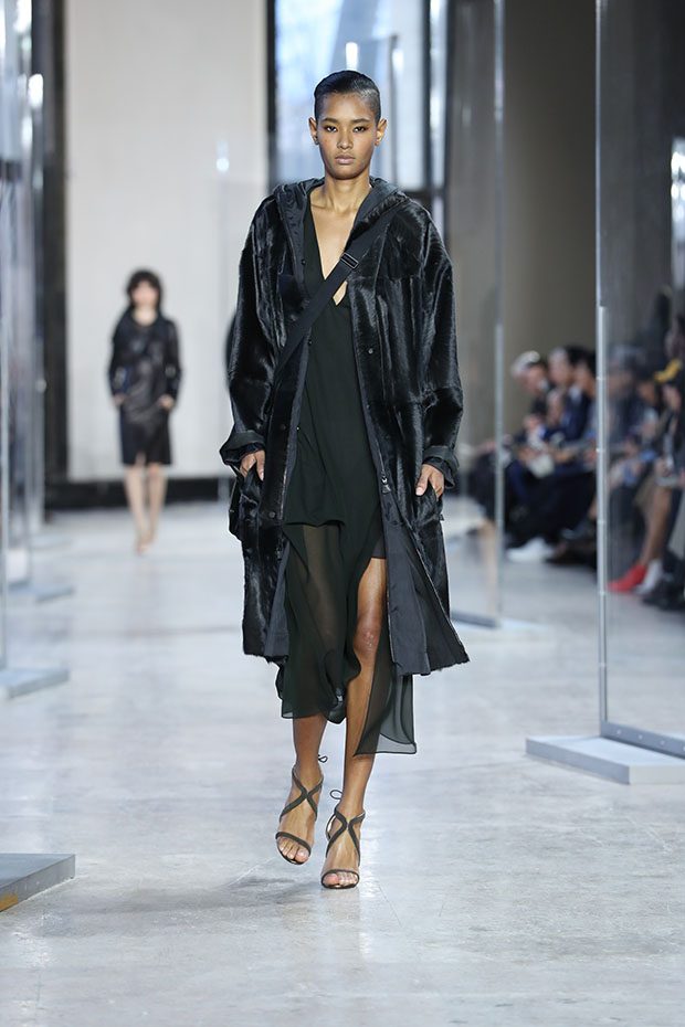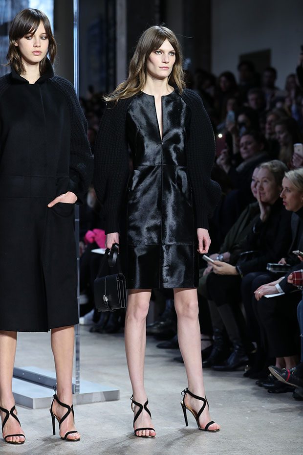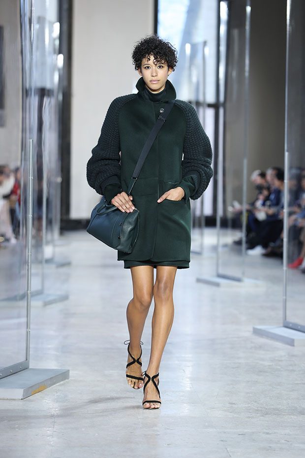 The coat and the bag, that is what a woman grabs before stepping out. When she slips into her coat, it happens in a dynamic, sensual and almost unconscious movement. This intuitive, dancing move has been captured by Canadian artist Rodney Graham in an installation (“Der Mantelanzieher”, 2015) as well as in a recent self portrait (“Coat Puller”, 2017). Albert Kriemler’s Akris Fall/Winter 2017/18 collection is about a woman in a coat with a bag. – from Akris