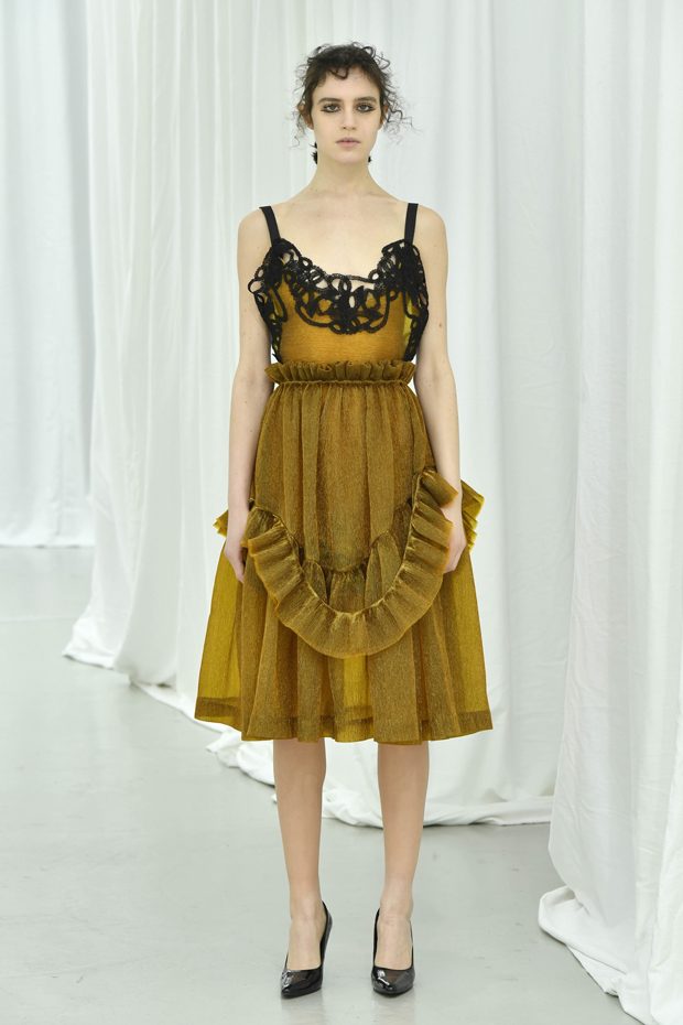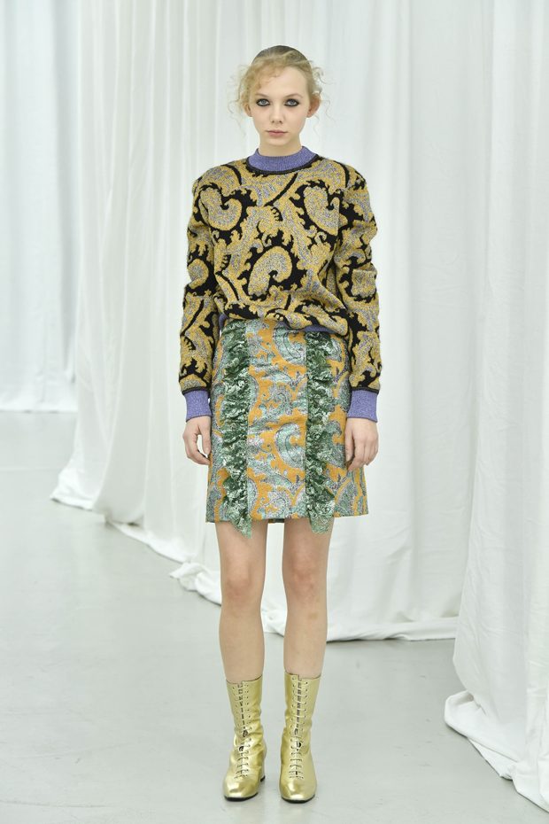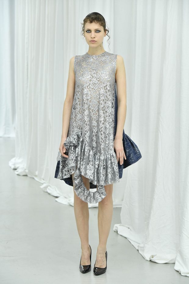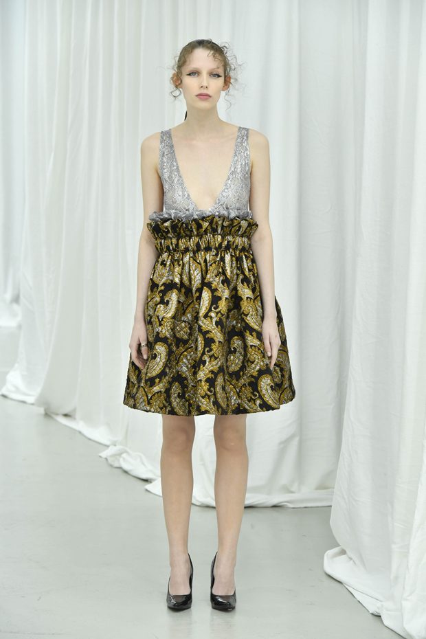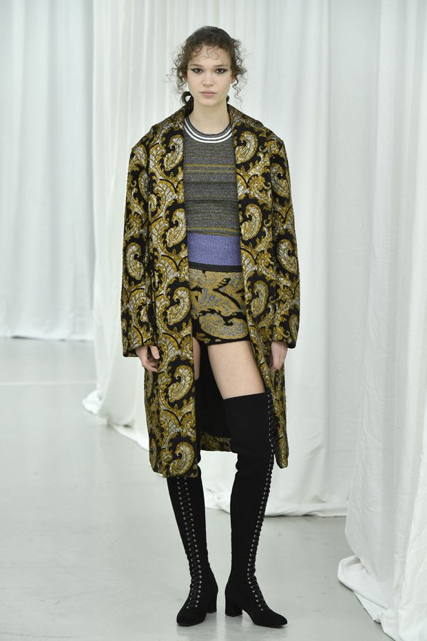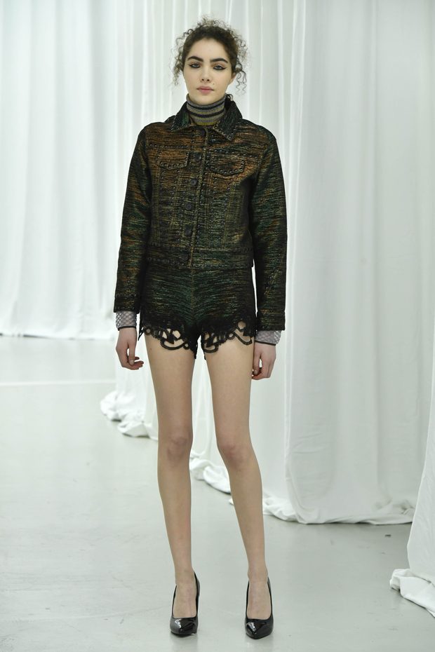 Pushing the envelope of femininity and embellishment in a modern way, Jourden goes baroque for this Fall Winter 2017 season. But as exuberant as some of the fabrics, volumes and clothes are, the collection – plumped with fancy, fun combinations – stays rooted in reality. Swirling lacy motifs embroidered on tulle create a dazzling impact on white or cobalt blue dresses and skirts, with sculptural volumes coming from bold undulating ruffles. Delicate and artsy lace trims trace the hems and necklines of structured slip dresses and minis in classic or jeweled tones. A rich psychedelic vibe pulses in the bold metallic paisley fabrics used on quilted robe coats, dresses and skirts cinched with a metallic lace frill, with volumes created from the use of two slightly different lengths at theback and front. A metallic shimmer animates the horizontal corduroy texture of cocktail dresses and skirts combined with laminated lace, or the iridescent surface of the signature Jourden jean jacket shape worn with micro shorts or cropped pants trimmed with oversized crochet lace. – from Jourden