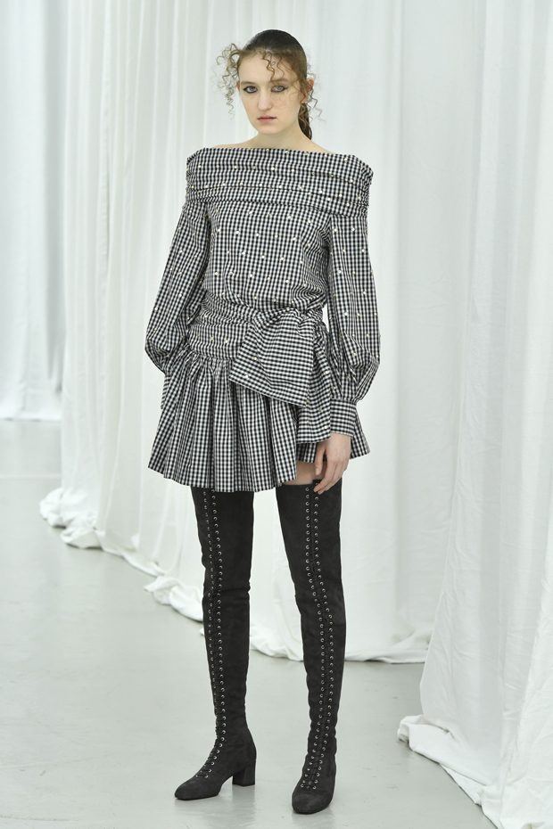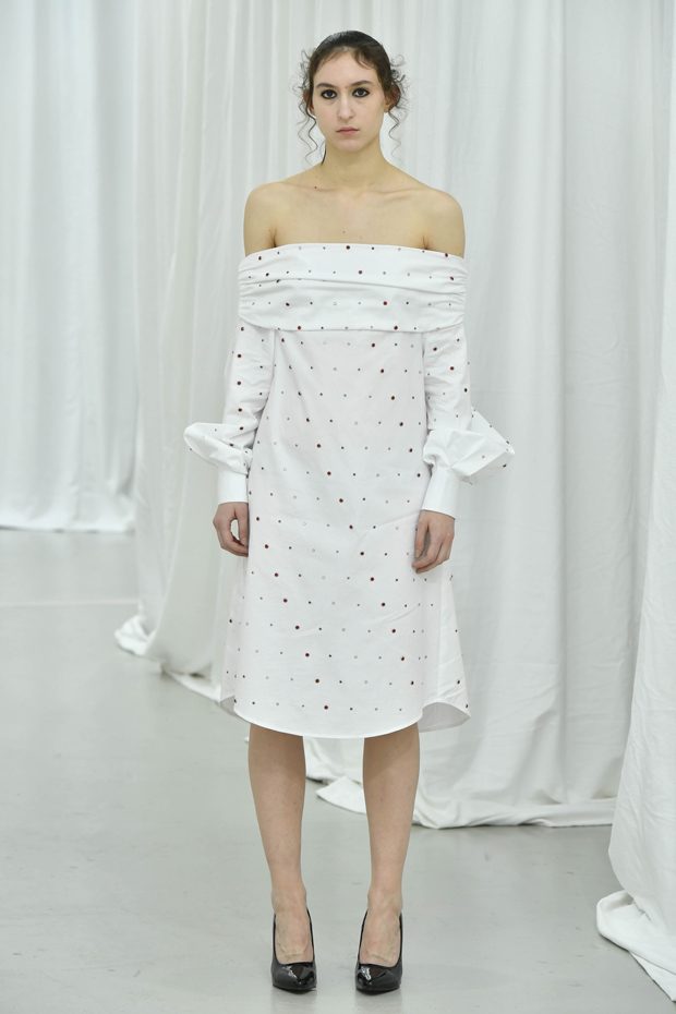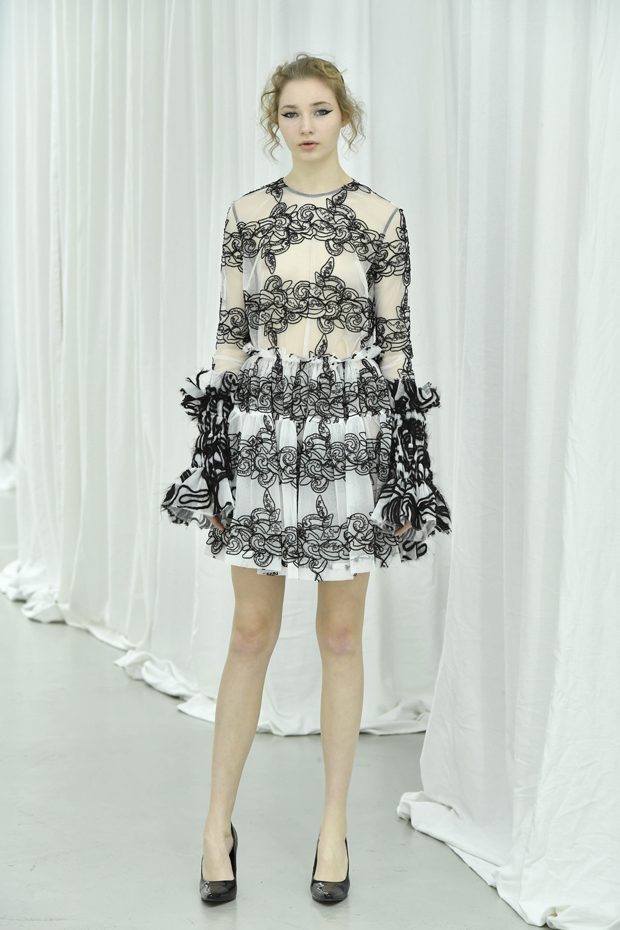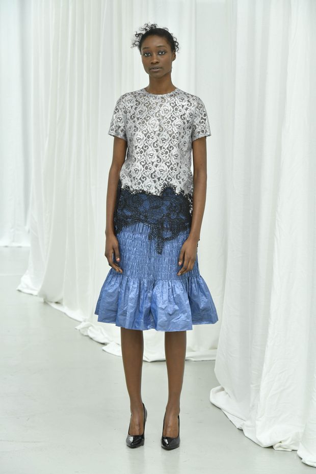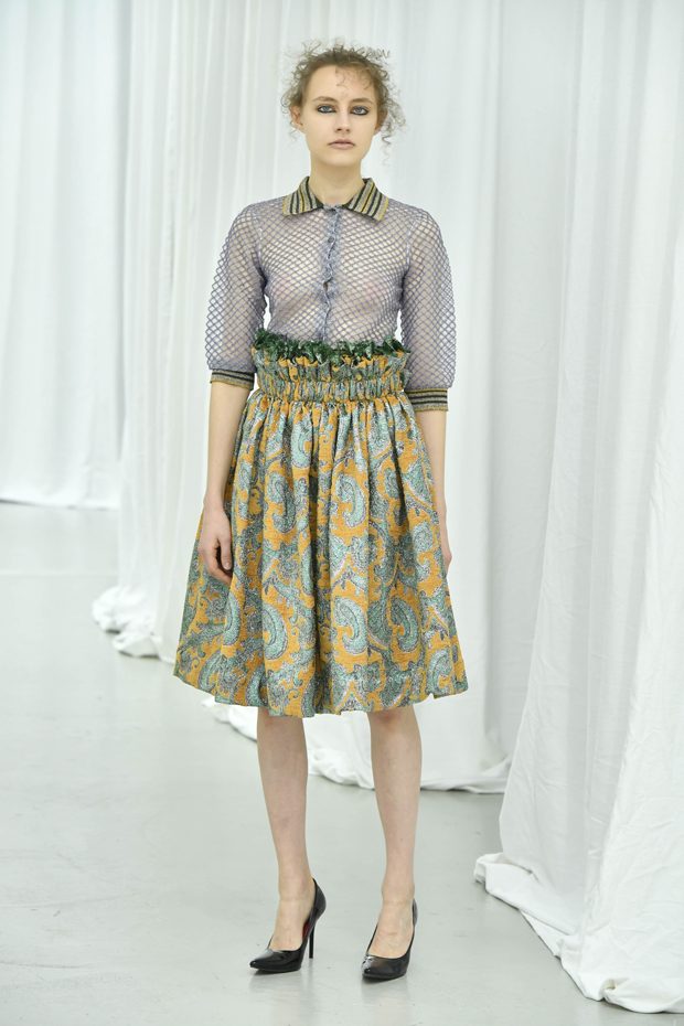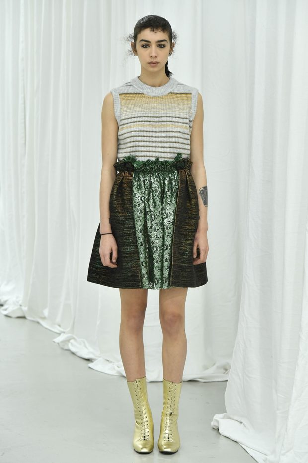 Pushing the envelope of femininity and embellishment in a modern way, Jourden goes baroque for this Fall Winter 2017 season. But as exuberant as some of the fabrics, volumes and clothes are, the collection – plumped with fancy, fun combinations – stays rooted in reality. Swirling lacy motifs embroidered on tulle create a dazzling impact on white or cobalt blue dresses and skirts, with sculptural volumes coming from bold undulating ruffles. Delicate and artsy lace trims trace the hems and necklines of structured slip dresses and minis in classic or jeweled tones. A rich psychedelic vibe pulses in the bold metallic paisley fabrics used on quilted robe coats, dresses and skirts cinched with a metallic lace frill, with volumes created from the use of two slightly different lengths at theback and front. A metallic shimmer animates the horizontal corduroy texture of cocktail dresses and skirts combined with laminated lace, or the iridescent surface of the signature Jourden jean jacket shape worn with micro shorts or cropped pants trimmed with oversized crochet lace. – from Jourden