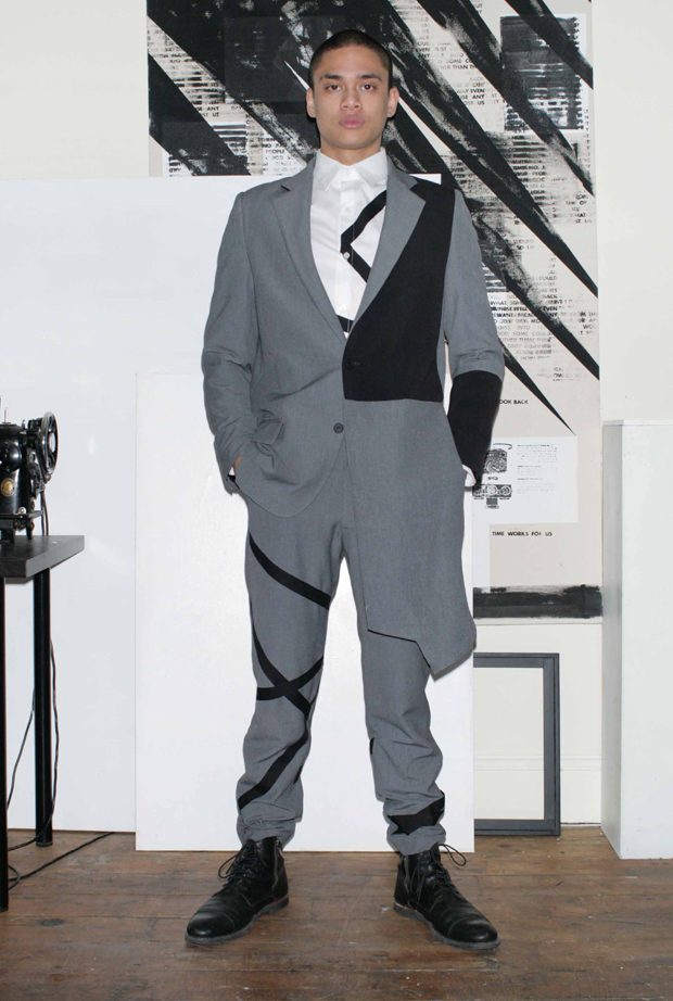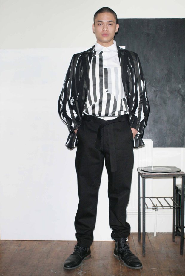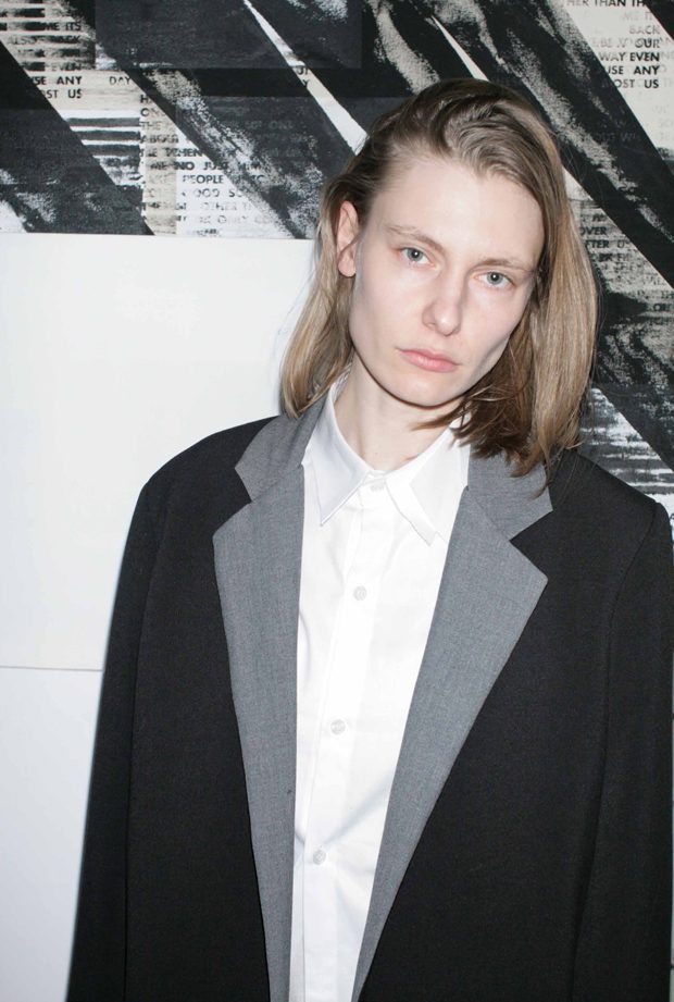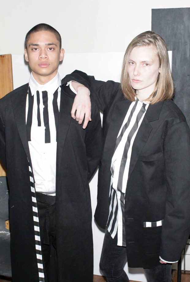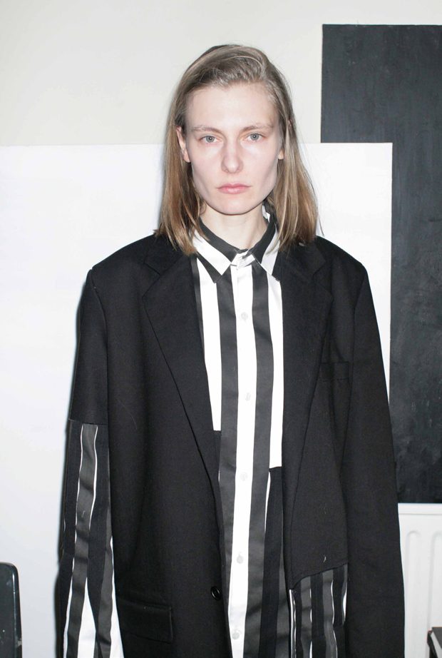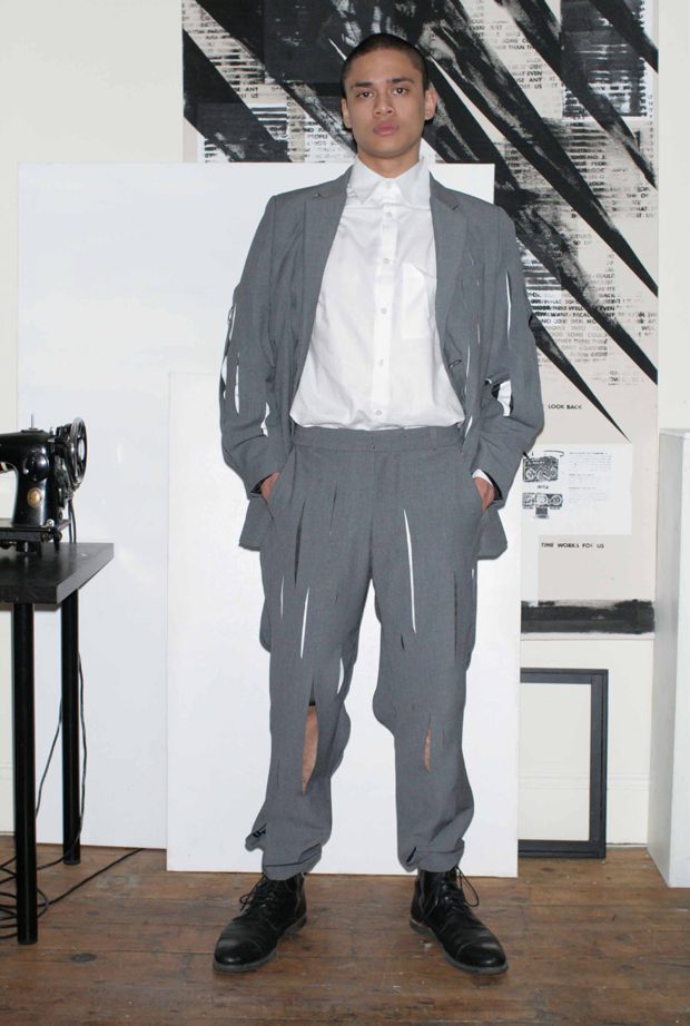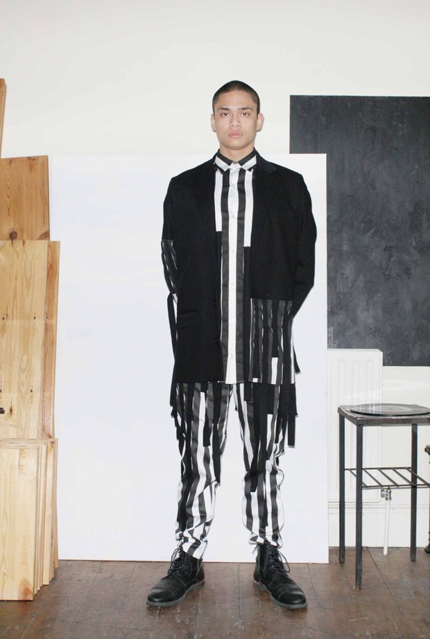 I was always very intrigued and dazzled by traditional tailoring. This is the starting point of every new collection. I deconstruct, rebuild, and through this cutting process, I create new elements. Hand embellished pinstripes and fringing threads are also additions to my pieces. Think of Kurt Cobain smashing a guitar on stage, the thousands of shattered pieces regroup to create a new, more powerful sound. – Ester Kubisz
