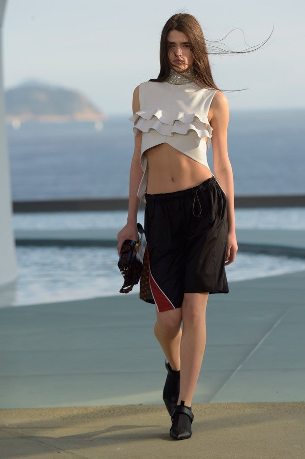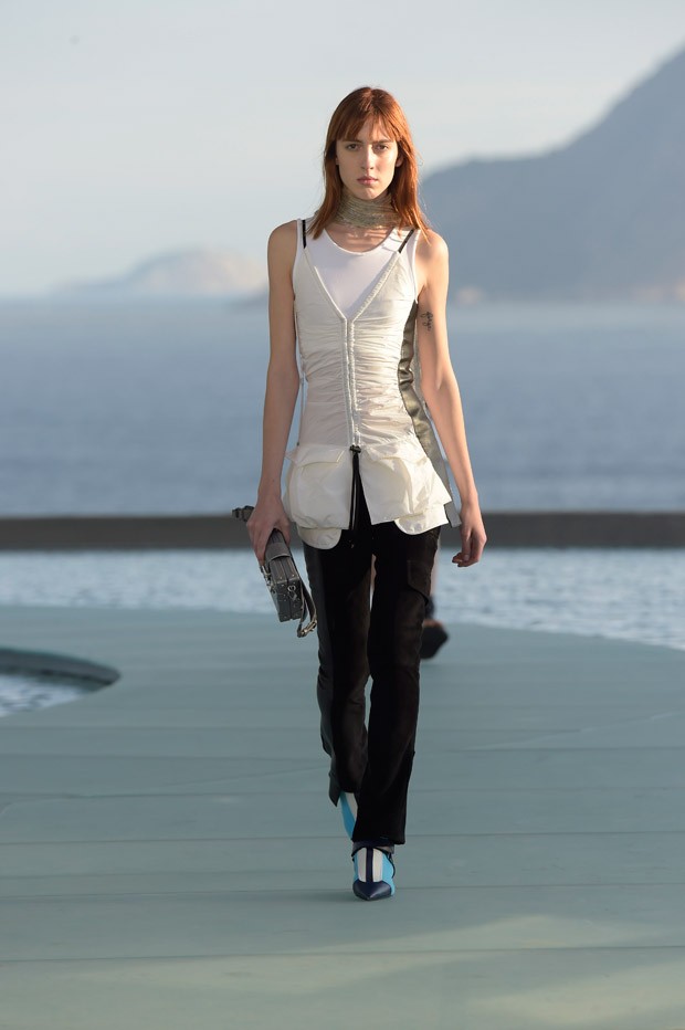 “I so admire the power of Oscar Niemeyer’s conviction. His vision, his radicality, his utopia even. Being able to show a fashion collection in such an architecturally powerful space is a sensorial experience. In Rio de Janeiro, what I saw most of all was movement and an explosive energy that lives somewhere between modernism and tropicality. I was fascinated by the constant duality between nature and urbanism and the pictorial explosion it creates. For me, the main question was how to incorporate into my collection all these elements that are part of Brazilian culture, without forgetting that I am just a visitor who brings his own Parisian and French cultural references to the moment.” – Nicolas Ghesquière