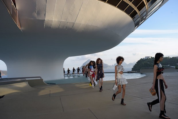 Louis Vuitton presented their latest Cruise 2017 collection at The Niteroi Contemporary Art Museum (designed and constructed by the architect Oscar Niemeyer in 1996) in Rio de Janeiro, Brazil. The 2017 Cruise collection pays homage to two major Brazilian artist Helio Oiticica, pioneer of the Neo-Concrete movement and an explorer of space through painting, and Aldemir Martins, an artist renowned for his paintings of flora and fauna, represented the vibrancy of his native region, the Nordeste.