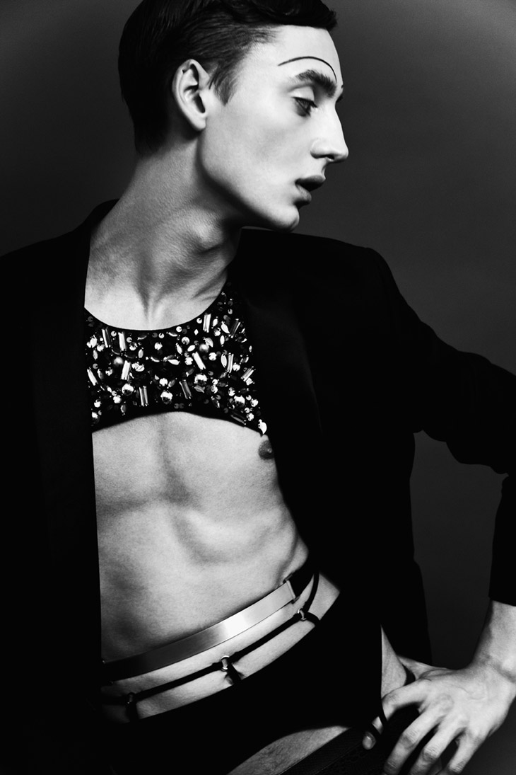 Krzysztof Wyzynski creates these striking new images for Base with model Filip Bala starring in Risque Cabaret story. Series is inspired by iconic 'Cabaret' movie, decadence atmosphere of 20./30. Berlin, androgyny and artistic photography from that time (even lightening with lamps from the same era).