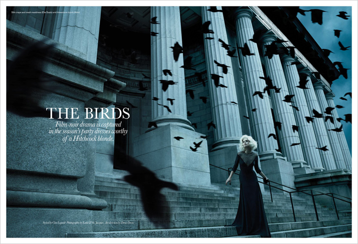 The Birds story finds inspiration in the iconic Hitchcock movie delivered to the pages of Elle Canada by talented photography duo Leda & St. Jacques. The photographers had help coming from fashion stylist Cloé Legault and art director Denis Desro. The gorgeous model is Pamelo from Mango Modeling Agency, while her hair styling and makeup are courtesy of Sabrina Rinaldi (Judy Inc/TRESemmé/ NARS).