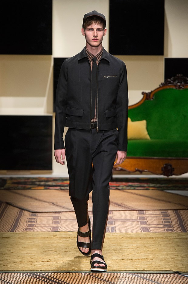 Jacob Morton one of our D’SCENE magazine cover boys had the honor to open the runway, and Giornetti was quick to show the must have item of the season. Perhaps a trend-report signal, the bomber jacket which dominated the runways opened up with a Ferragamo interpretation. Hardly repeated afterwards the jacket was a splendid match to the elegant stripey trousers.