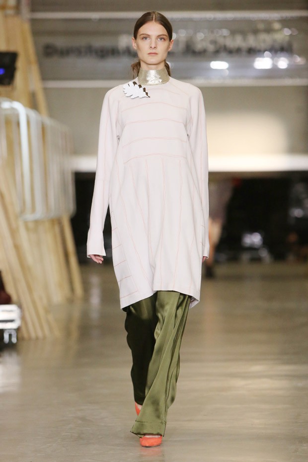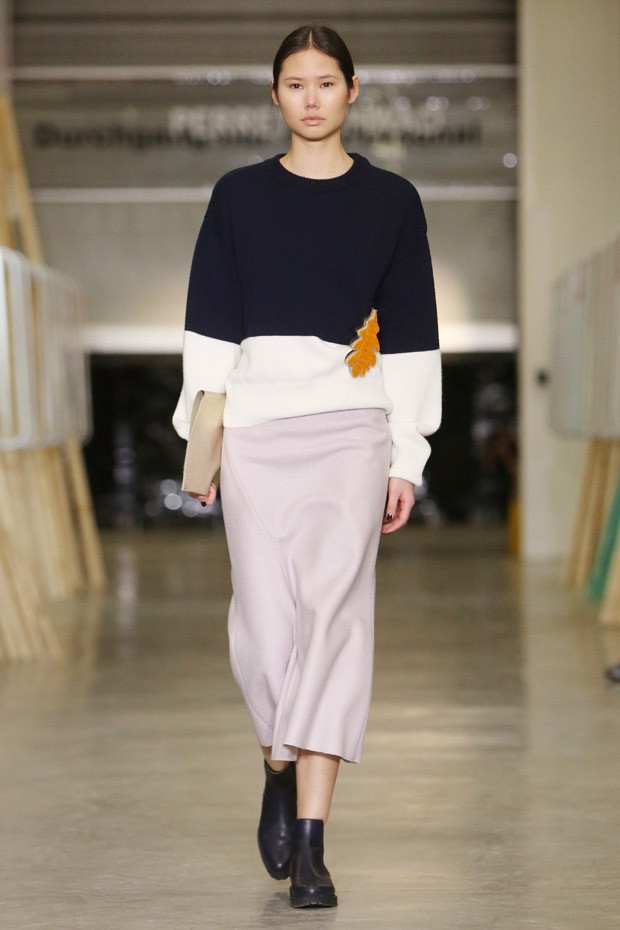 “This season’s offerings capture the changing moods of an urban autumn, fluctuating between warmth and style. Reflecting the contrasting cityscape, the collection’s palette mixes heavy greys, rich tones and cool pastels. Fluid transitions define a subtle yet elegant look, highlighted by metallic accents and strong oranges, echoing the modern facades of the city“