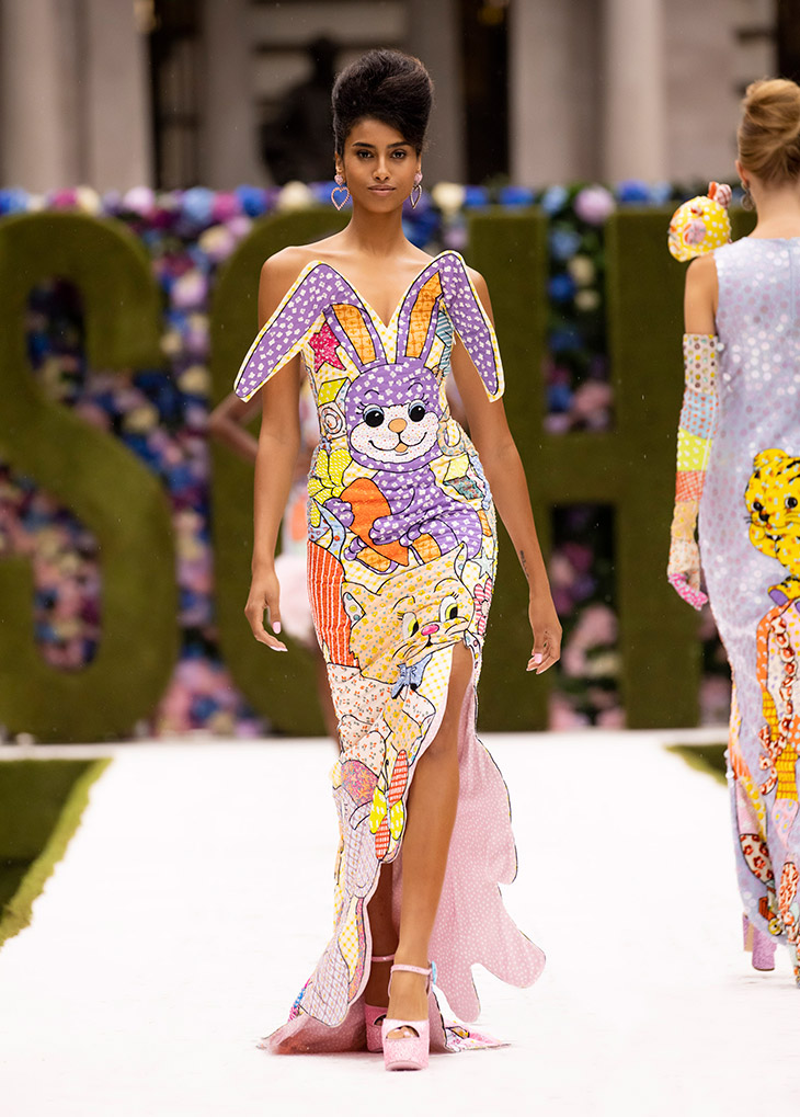 Designer Jeremy Scott presented MOSCHINO Spring Summer 2022 Ladies Who Lunch Collection, that tells a sartorial nursery rhyme, on Thursday, September 9th, during the ongoing New York Fashion Week. The collection reimagines Franco Moschino’s classic suits and separates through rose-colored glasses, with lots of nostalgia and novelty. It brings the illustrated animal prints that include bears flying kites, poodles with flower crowns, seals balancing striped beach balls, and giraffes pulling trolleys full of blossoms.