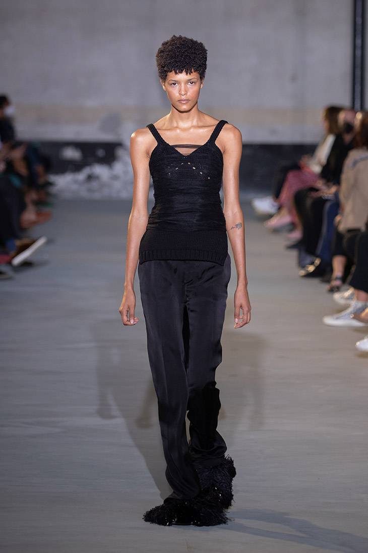 “There is nothing artificial, unnatural or contrived about the N°21 spring/summer 2022 collection. Knit skirts, dresses, pants and tops feature traditional stitchwork, while in succumbing to the temptation of couture, minidresses take on chiffon shoulder straps and feather borders. Straight leg pants, too, have feather trim, skimming slip-on shoes with cellophane fringe. Similarly, bodysuits, jackets and micro skirts come in cotton canvas complete with allover crystal beading. As for the bombers, the women’s pantsuits and the men’s business suits, all jackets are constructed with six layers of nude color tulle where palm-tree print lining shows through. Sweaters as well have rich tulle overlays. For women these sweaters often become bustiers, while knit tops assume a brassière shape and minidresses play fancifully with sequin fringe. Likewise, knit shorts for men are paired with wool sweaters having shiny crystal beading. And hand-knit micro skirts alternate with cotton ones sporting slogans. What comes next is a mix of industrial and sartorial techniques that leads to the creation of bias-cut dresses where hidden drawstrings add draping straight from a couture manual. Lastly, feather harness tops and marabou stoles abound in the role of indispensable accessory, more so than in that of additional detail.” – from N°21