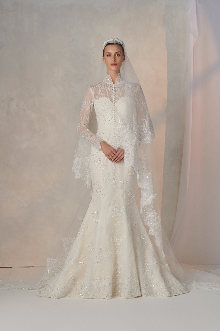 “Rich materials and decadent details form the foundation of the outstanding collection, elevated further by the inimitable dexterity and artisanship of the Al Ali atelier. Sumptuous satins, delicate French laces and whimsical tulles are artfully adorned with ostrich feathers, handcrafted Swarovski crystal embroideries and immaculate beading to create exquisite gowns and veils that are designed to echo the sentiment of a once-in-a-lifetime occasion. A testament to the couturier’s acclaimed creative vision and his unwavering passion for uncompromising mastery and savoir-faire. Spanning across the entirety of the collection is the immaculate attention to detail that is a hallmark of the Rami Al Ali brand; transforming every look into a one-of-a-kind creation that echoes an unforgettable appeal that transcends occasion and time.” – from Rami Al Ali