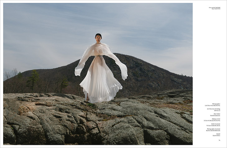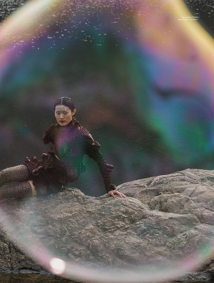 The striking Xian Peng stars in Kingdom of Crooked Mirrors story captured exclusively for DSCENE Magazine‘s The World We Live In edition by fashion photographer Lavina Solo. In charge of art direction and styling was Iryna Li, assisted by Yulia Tereshchuk, with beauty from hair stylist Nami Harada, and makeup artist Julia Schelkonogova. For the session Iryna selected pieces from brands such as Delfina Balda, Burberry, Gucci, Gucci x Balenciaga, Corban Harper, Dries Van Noten, Prada, Marques’ Almeida, Christopher John Rogers, Feben, Saint Laurent, Viktor & Rolf Mariage, Shuting Qiu, J’Amemme, and Valentino. Photo assistance by Maya Erdenberger.