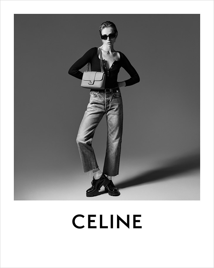 Luxury house Celine unveiled its Summer 2024 advertising campaign starring supermodel Edie Campbell photographed and styled by the brand’s creative director Hedi Slimane. In charge of beauty were hair stylist Esther Langham and makeup artist Aaron de Mey. For the campaign Edie is wearing selected pieces from Tomboy Collection, presented back in September against the breathtaking backdrop of the Bibliothèque Nationale in Paris, such as Lola bag, wool jacket, embroidered silk skirt, triomphe derby, teen victoire, Celine Paris sweatshirt, Wesley shorts, triomphe leather cap, knitwear bodysuit, polly jeans, triomphe derby, triomphe sunglasses, classic jacket, and entimental baguette necklace.