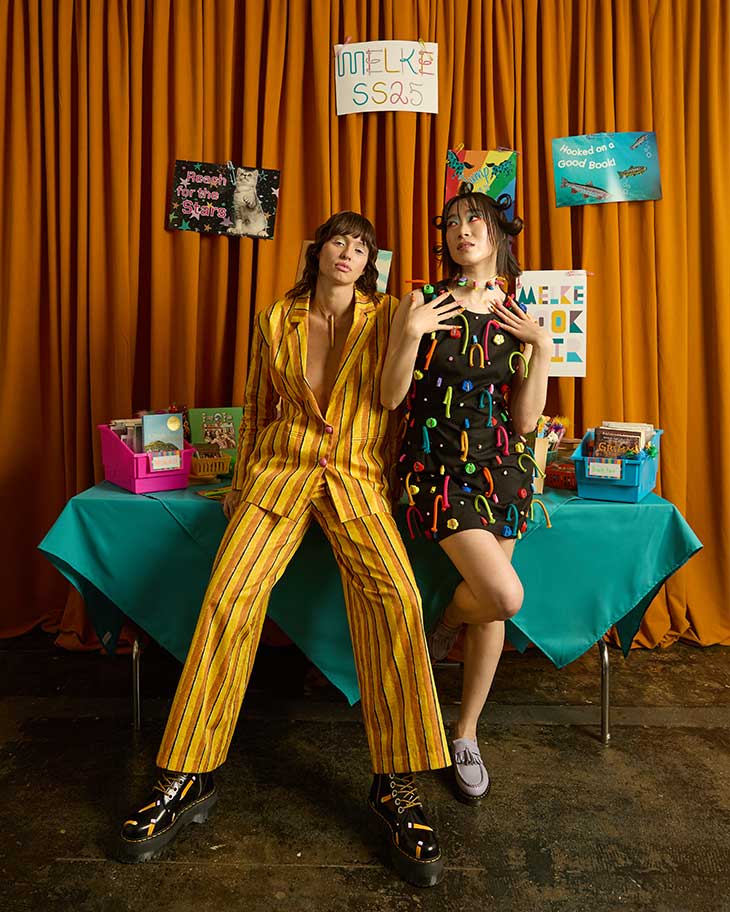 The MELKE SS25 collection, titled The Book Fair, transported audiences back to the playful days of childhood, evoking the excitement and nostalgia of the Book Fair. Designer Emma Gage, known for her playful and youthful approach to fashion, crafted a collection that embodied the childlike wonder associated with the anticipation of these school events. Drawing from her own fond memories of haggling with her parents for cash to buy the latest installment of Pony Pals or collecting quirky school supplies like bendy erasers and ostrich pens, Gage tapped into a universal experience that resonated with many.