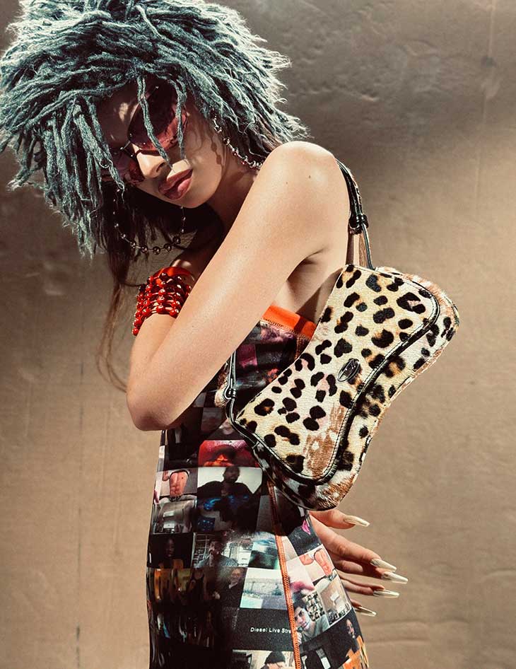 Accessories also play a significant role in the campaign, enhancing its vibrant narrative. A new iteration of the Play bag, crafted in pony hair leopard print, makes a striking statement alongside the D-Sruptor watch, featuring a striking green iridescent crystal face. Completing the look are bold black and silver chain necklaces and bracelets, as well as shield-like metallic mirrored wraparound sunglasses developed in collaboration with Essilor Luxottica.