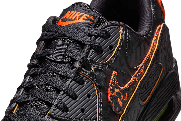 Fiery laser orange and magma-red accents flow across the shoe, emphasizing areas such as the Nike Swoosh, eyelets, and heel tab. These vivid details mimic the intense colors of flowing magma, lending a sense of movement and energy to the design. The Swoosh, outlined in a gradient of orange, stands out as a bold visual statement, as though streaks of lava were etched onto the sneaker. The heel tab, marked with the Air Max branding, also features a cracked, volcanic pattern, detail that deepens the theme and adds a layer of storytelling to the design.