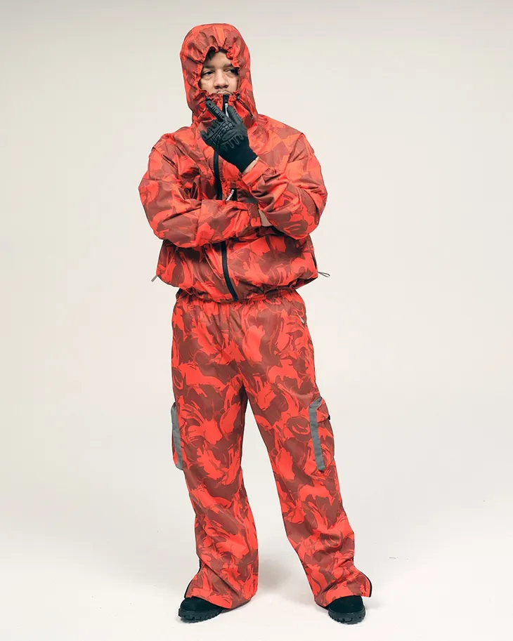 This season, Emory’s designs explore themes rooted in American identity, particularly the African Diaspora. Tracksuits and oversized denim bomber hoodies form the backbone of the collection, with each piece reflecting a distinct nod to cultural and historical motifs. Camo prints, often associated with resilience and rebellion, are prominently featured, integrating heritage with urban utility in a cohesive manner. The color palette ranges from earthy tones to vivid pops of color, emphasizing the duality of tradition and modernity.