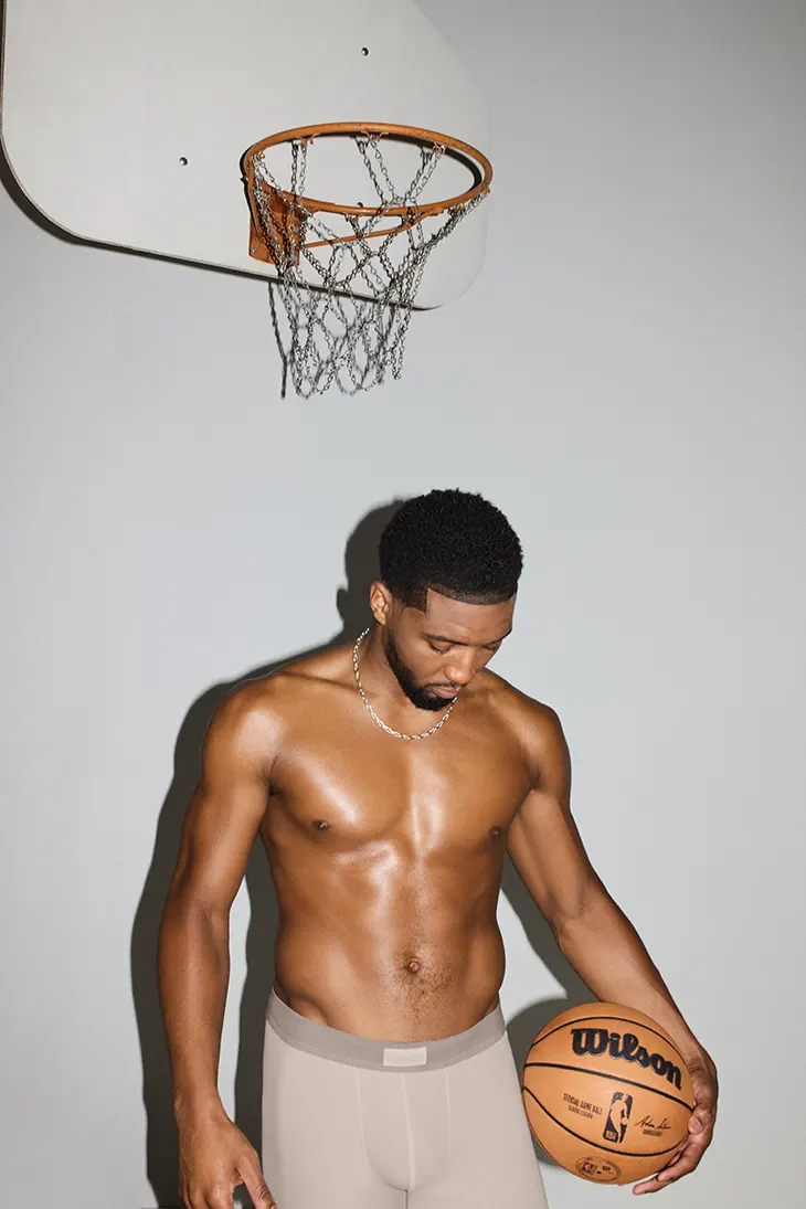 Photographer Eric Johnson captures Mitchell against a pared‑back set that oscillates between locker‑room focus and off‑day calm. The imagery leans on motion rather than props: a defensive slide, a quick first step, a relaxed stretch on the training table. Each frame highlights the 5‑inch boxers from Skims Mens Stretch and Cotton lines, base layers that track the body instead of fighting it, staying put through cuts, bumps, and whatever weight‑room circuits the All‑Star’s routine demands.