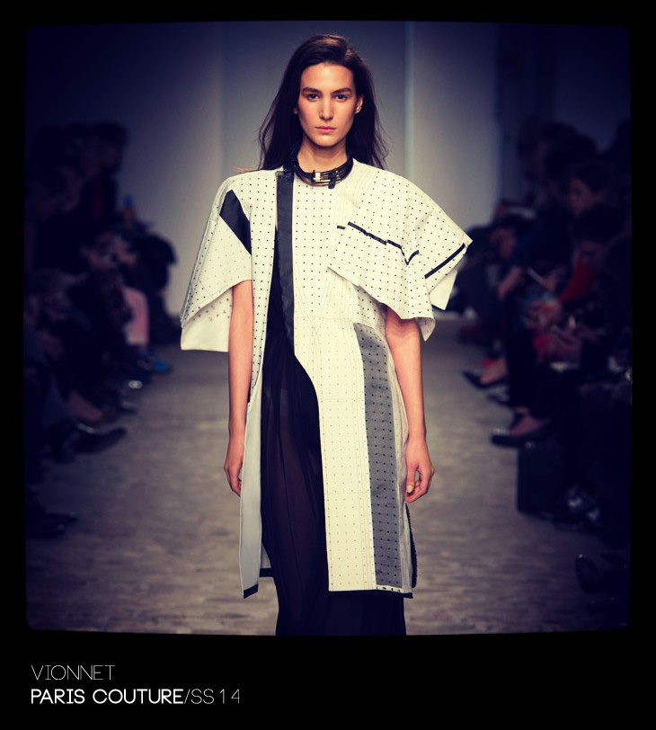 Hussein Chalayan’s first couture collection for the Vionnet house successfully echoed the thoughtful, methodical spirit of Madeleine Vionnet (inventor of the bias cut), without being bogged down by stringent referencing. Chalayan’s demi-couture collection discarded the fluff and played on clever contrasts. Bull’s-eye pattern cut outs on floor-length dresses with layers of tulle, were a sensual play on concealing and exposing. His industrial-looking, stiff metal belts and necklaces cinched the voluminous layers of airy fabric, giving a much-needed hardness to the almost lingerie-like, sheer fabric and soft femininity of the clothing. His cuts were strong and clean while his discreet revealing of body parts, soft fabrics and colours – mainly white and nude with accents of orange, neon yellow and black – mixed a sensual vulnerability with an unfussy, minimal modernism.