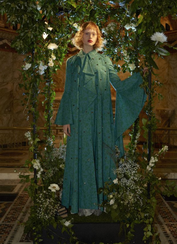 “Alistair James continue to explore unique hand-drawn prints in SS18, the briar rose taking center stage as a symbol of both beauty and danger thanks to its barbed thorns. In particular the duo’s bespoke “Enchanted Briar” jacquard, with its woven metallic emulating a floral spell. For this season Alistair James partners with Swarovski to create a magical ambience of the fairy-tales that have inspired the collection The crystals themselves are being used in a range of ways, from draped chains to bespoke heart and star embellishments.”