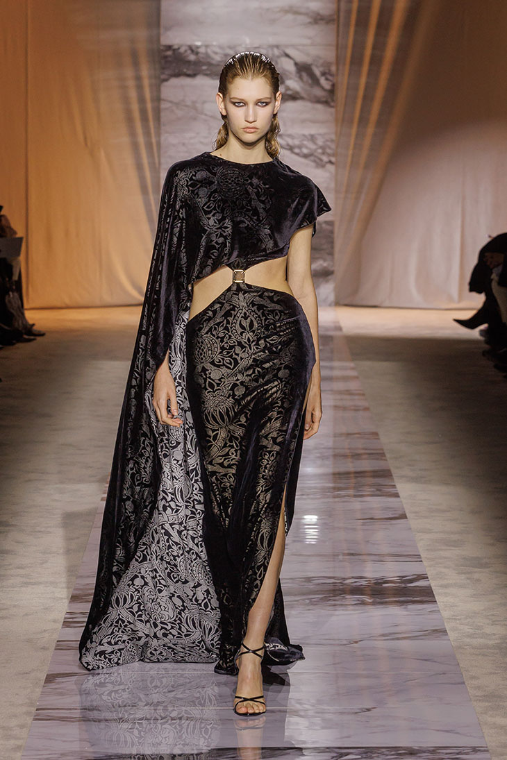 Highlighting the collection are two couture creations, look 17, a mini dress with a trapeze silhouette, crafted in black velvet and silk twill, features a Marble print in stark black and white, decorated with jewel straps, black leather, velvet inlays, micro embroidery, and crystal details, as well as, look 23 with a V neckline and a 3D effect Marble jacquard upper part, coupled with a skirt in Red Marble print silk twill. This look is distinguished by cut-out details, red velvet, and leather inlays, along with micro embroidery.