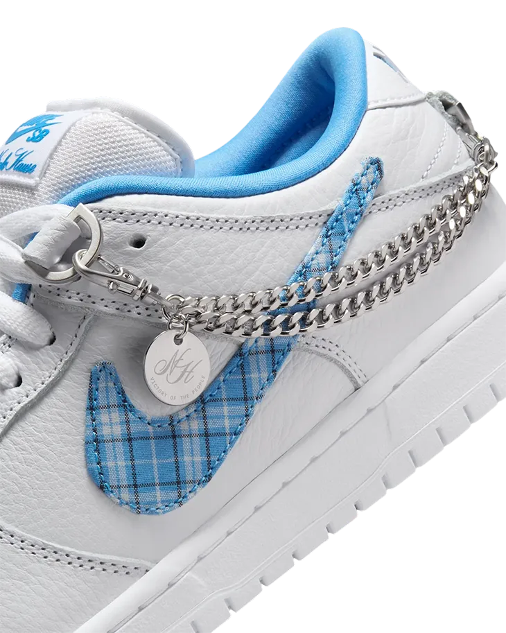 The design begins with a premium white tumbled leather upper, serving as a pristine backdrop for the shoe’s standout features. The University Blue Swoosh, rendered in a plaid pattern, adds a layer of visual intrigue and pays homage to Hause’s distinctive aesthetic.