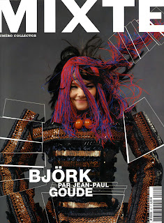 Björk is on the cover of "Mixte" magazines September issue, which is published with two different covers, main and alternative cover. Both covers feature Björk, photographed by Jean Paul Goude, shes wearing Dior Haute Couture Dress, and Claudia Leclerc necklace. (Main cover is posted as second image.)