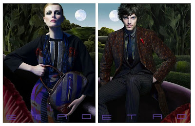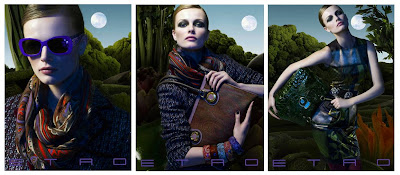 In February, for Millan Fall Winter 2008.09, Etros show venue was maybe even the most unique stage of the season, with a bundle of greenery, a garden full of vegetables going through middle of the stage, and yes, even making models walking on dirt. Therefor, I am certain that the same green theme was in mind of the Etro designer, and art directors when they got to the ad campaign for the Fall Winter collection, which i posted above. To see some images from the Etro Fall Winter runway show click HERE .