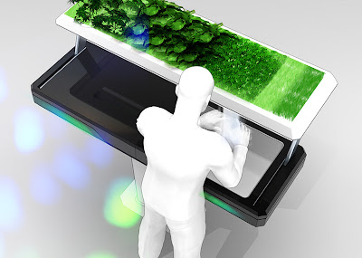 Industrial designer Antoine Lebrun, did an advance study design for Fagor Brandt, which was a prototype of a future kitchen, 10 years from now. The kitchen would be a green multifunctional appliance, in closed position the system is in washing mode. Open it to access the cooking functions, where on main surface you can prepare and cook, when closed after use, the workspace and sink (including dishes inside) are washed up with natural soap provided by pants. Click on the images above to enlarge, for more of Antoines designs check out his website portfolio, HERE is one more of the photos.