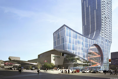 The redevelopment of the Sony Centre for the Performing Arts has been designed to boast the new L Tower Condominiums, an arts and cultural facility dubbed the Arts and Heritage Awareness Centre (AHA) and the revamped existing theater structure. Libeskind’s design proposal held the cultural component of the L Tower and Sony Centre for the Performing Arts central to the concept – offering a fresh residential approach promising to integrate inner city life with culture and the arts. Yet the residential tower component comprises the majority (428,000 sq ft) of the overall redesign. Situated atop the cultural facilities, it will contain approximately 470 units and rise to a height of 57 stories, providing views over downtown Toronto and Ontario. The L Tower will have a concrete structure with glass curtain wall and window wall cladding. Prices of the desirable apartment’s suites start at C$ 589,900 and penthouses range from C$ 950,000 to C$ 2.5 million. While the residential tower will doubtless continue as planned, Toronto plays a waiting game to see if the heart of the L tower will be one of commercial cultural significance. Source: World Architecture News