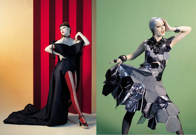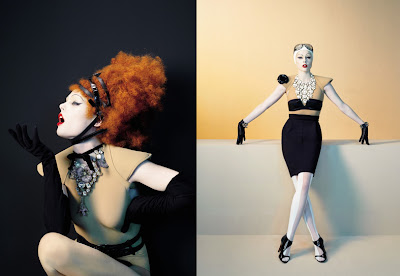 Coco Rocha, the star of Jean-Paul Gaultier’s fall winter show, continues in the same spirit and styling for pictorial Espirits Couture par Jean-Paul Gaultier of french Les Echos magazine, who’s guest fashion editor for the issue was the designer himself. Coco is wearing Jean Paul Gaultier Fall Winter 2009.10. including accessories from Maison Martin Margiela and Hermes.