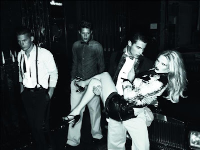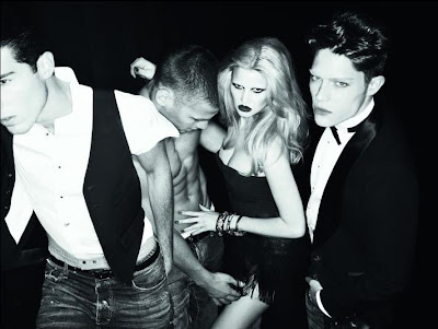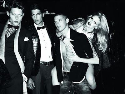 Lara Stone parties with Kerry Degman, Antonio Navas and Cesar Casier in front of camera of Mert & Marcus, for the latest DSquared Campaign. More images under the cut: