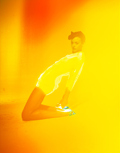 "The images were made by combining two images. The preliminary photos were taken with the model wearing clothing over a green body suit, the body and background were then stripped away in post production and then only the clothing was projected onto the model, who had to take the same pose as in the initial photos".