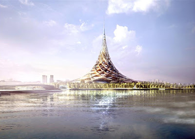 Conceived as a city in microcosm, Crystal Island is an unprecedented, compact and diverse urban quarter. Situated on the Nagatino Peninsula, edged by the Moscow River, it is located only 7.5 km from the Kremlin. Rising from a large public square, the entire development is enclosed within a vast tent-like superstructure, with one of the tallest inhabited buildings in the world at its heart. More under the cut: