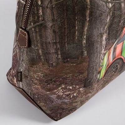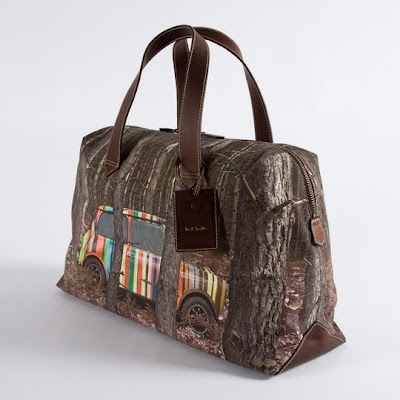Paul Smith Boston bag printed with a seasonal Mini on location print. The autumn/winter 2009 picture is taken in Sherwood forest. The bag is styled with smooth chocolate leather handles and a studded protective base. More images after the jump: