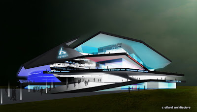 Conceived as a condenser of programs and activities, Area 6 integrates an Arena with spaces to showcase, test and play with the latest gadgets in the market. A multi functional program is distributed through ramps and slabs, shaping the building for a unique experience. At the immediate entrance showrooms display the newest electronic products while the platforms in the facade house TV Studios, Hollodceks, theaters and retail spaces through three levels. A tipple high atrium splits the program between the arena and the “gaming platforms”, while creating a multi functional space flexible enough to interact with both ends of the building. The metal facade mutates depending on the weather conditions and on the hours of the day, giving the building a look that reflexes the dynamism of the program that it’s hosting. More images under the cut: