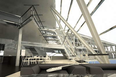 Eco-friendly features like the water desalination, energy accumulation, ventilation methods, water recycling, heat and energy consumption, tidal and solar energy systems are all there. It is not only the installations, but it’s form and orientation. Vertical lines on the facade are the rails for computer driven shading system. – from ArchDaily