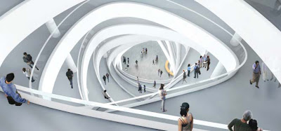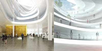 The façade is designed to serve as a climate buff er, changing in response to specific qualities of light or images projected onto it. During the dark winter months, it will be visible as a glowing landmark. A rare books showcase takes the form of a cube set in a double-height space on the ground fl oor, which also functions as a reading room for the university’s special collections library. In addition, the showcase connects the public space on the ground fl oor with the vast stacks that lie in the basement. A large organic opening that cuts through the fl oors at every level creates continuous visual connections throughout the full height of the building. This atrium is the central hub of the building.