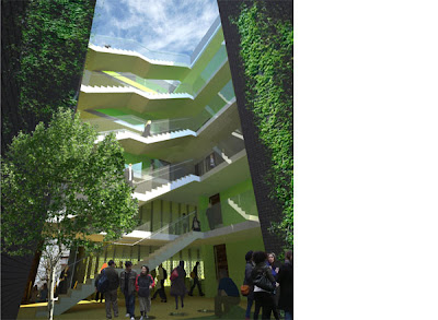 Nam House, situated in Hackney, acts as a beacon for the local and international Vietnamese community, providing retail and office space for the client alongside community space and an apart-hotel that is open to the public. The building is conceived of as a “village in a building” linking flexible event spaces and commercial uses around a courtyard garden. Green spaces in the courtyard, roof gardens and on the facade are joined to increase the bio-diversity of the exterior spaces. The building will raise the profile of Mare Street contributing to the regeneration of the area. More images after the jump: