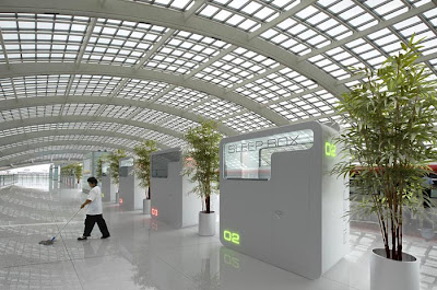 SLEEPBOX is a small mobile space (box) 2mx1.4mx2.3m (h). The main functional element in it is a bed 2×0.6 m., which is equipped with automatic system of change of bed linen. Bed is soft, flexible strip of foamed polymer with the surface of the pulp tissue. Tape is rewound from one shaft to another, changing the bed. If a client wants to sleep in maximum comfort, he can take the normal set of bed linen for an extra fee. SLEEPBOX is equipped with a ventilation system, sound alerts, built-in LCD TV, WiFi, sockets for a laptop, charging phones. Also under the lounges is a place for luggage. After the clients exit, automatic change of bed linen starts and quartz lamps turns on. Payment can be made on a shared terminal, which provides the client with an electronic key. It is possible to buy from 15 minutes to several hours.