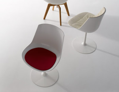A family of seatings of great impact and comfort. Designed for the home, the office and the community areas. The shell, made from polycarbonate, is mass-pigmented in white, black, grey, and has a standard double finish: gloss outside, and goffered inside. Base options: 4-legged, sled, sled with arm, 5-legged, 5-point-star, with central leg, 4-legged in oak. Continue for more after the jump: