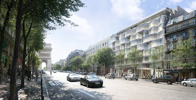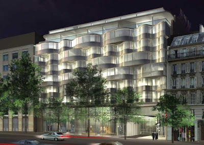 The Renaissance Paris Arc de Triomphe Hotel has opened in March, 2009. The seven floor, 188 room hotel, designed by architect Christian de Portzamparc, is characterized by undulating horizontal glazed bands, which accommodate the rooms bow windows to maximize views of the area. More images after the jump: