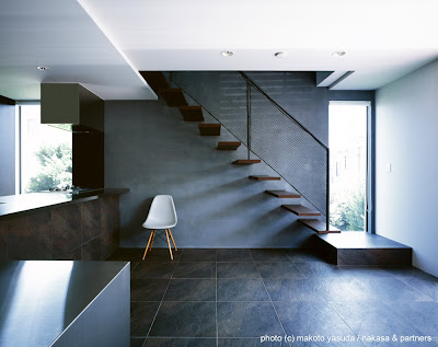 This is a three-storey timber house for a single family with two small kids. The site is situated near a noisy main road in Tokyo and surrounded by small offices and dwellings. Continue for more after the jump: