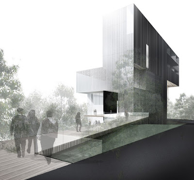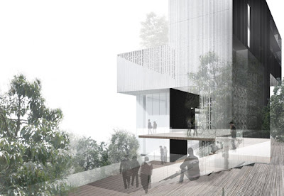 The new Architectural School Building sits on the edge of the hilly campus with a scenic view of the Tolo Harbour. We proposed an architecture in the form of a mass pierced diagonally to preserve the view to the sky, with an “acropolis route” to continue the uphill movement from the railway station to the different elements of the School. The Void reveals the studios at the heart, conveying and enhancing the School’s ethos as studio-based, humanistic and open. Continue for more after the jump: