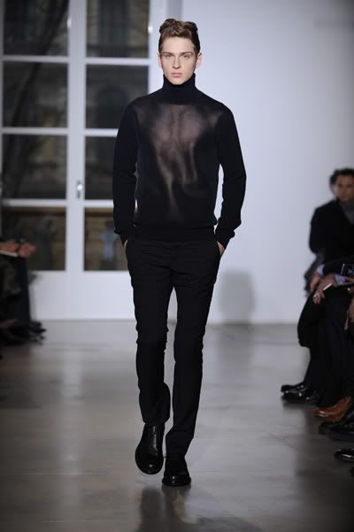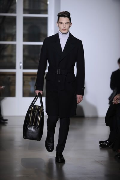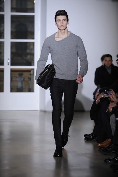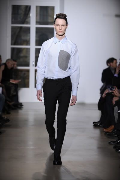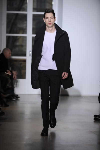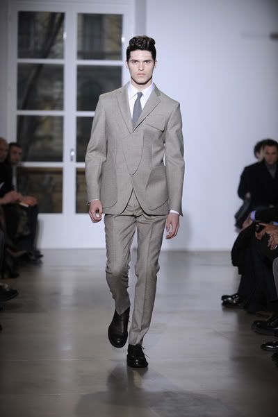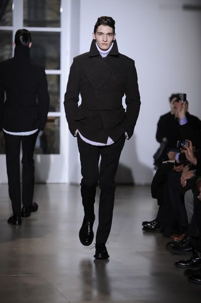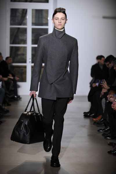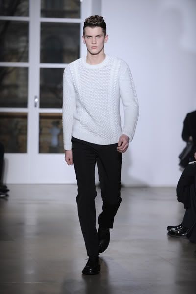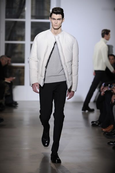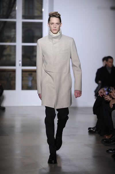 For the next Fall Winter 2010.11 Jil Sanders designer Raf Simons gave us a precise city tailoring with an unconstrained appeal. A tailored line injected with energy, focusing on shape and a forth-looking approach, using texture and construction to define a confident masculinity. Three essentials the caban, the blazer and the knit pointed into a redefinition of the menswear heritage. With his preference for pastels, Simons enriched the line with bright interventions of ivory, beige, oyster and dove. While the asymmetrical necklines, monochrome patchwork and abstract swirls traced the outline of fine knitwear and doubled waistcoats, softly worn over tailored blazers. Continue for more images of Jil Sander Fall Winter 2010.11 menswear collection after the jump: