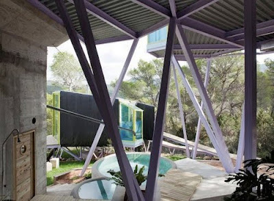 This residence designed by Andrés Jaque Arquitectos in Ibiza, Spain is an environmental project aimed at preserving the beauty of its natural surroundings while the use of an aquamarine color keeps the continuity between the inside and the outside. The house consists of three parts: a main house and two huts. These three elements have distant views of the sea and their separation allows an easy division of the garden. Continue for more after the jump: