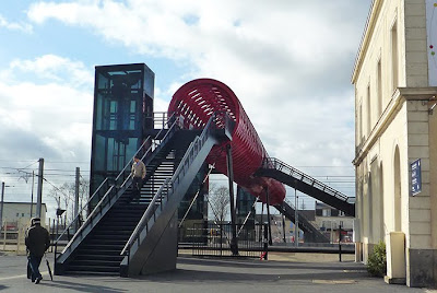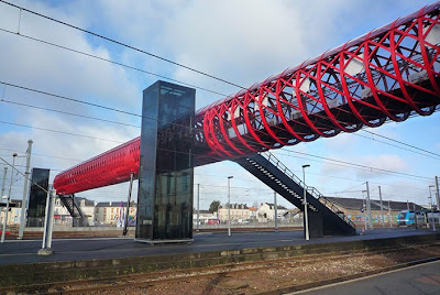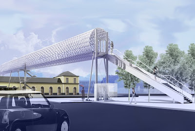 The extension of the TGV train to La Roche-sur-Yon and nearby towns bordering the Atlantic marks not only an important moment for the modernization of the European and French train network, but also an occasion to initiate civic improvements. Linking the historic city founded by Napoleon (“the Pentagon”) with new neighborhoods, this pedestrian bridge crosses above high-speed railway tracks, providing an important urban connection for the town. Continue for more after the jump: