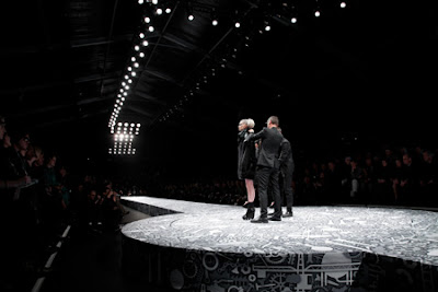 The base of the scenery is a pattern we originally composed for a series of marquetry objects, titled ‘Industry’ (2008). Specially for the occasion Nynke transformed the pattern into a more theatrical, 3D form that reminded us slightly of Fritz Lang’s Metropolis. Together with Viktor & Rolf Studio Job decided to totally wrap the giant catwalk backdrops with 1000 m2 ‘Industry’! It was pleasant to see how naturally this architectural scene was absorbed by the glamour and fashion industry. Continue for more after the jump: