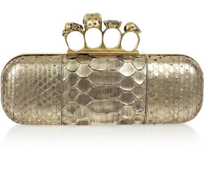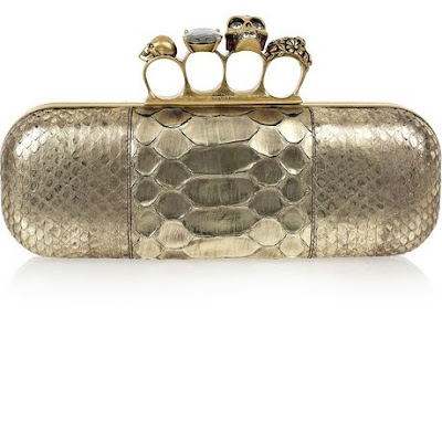 Timeless accessory piece from Alexander McQueen Spring Summer 2010 collection, gold metallic python box clutch with brass knuckle duster clasp embellished by McQueen’s signature skulls. Accessory, investment piece or art, view more after the jump: